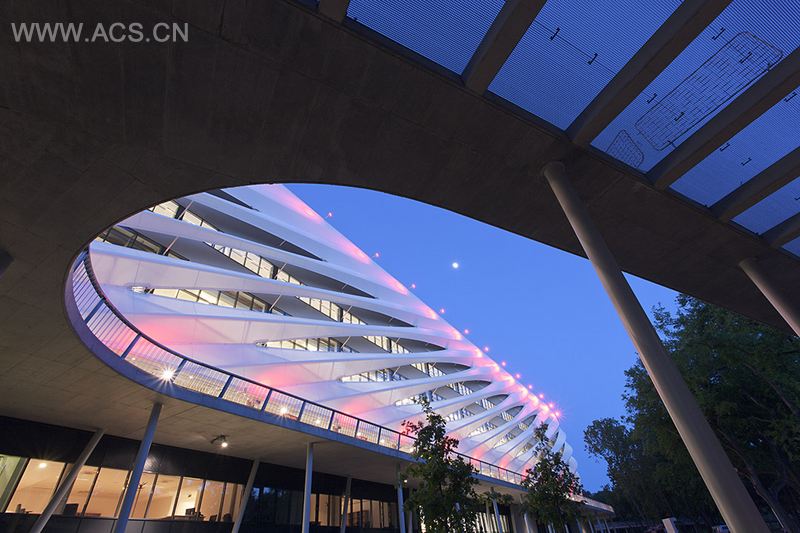 为了将观众通道与公园休息区清晰地分隔开来,设计师在体育场周围设置了树冠高度的人行通道,通道如彩带般绕缠着巨大的体育场馆。人行通道勾勒出公园活跃区的界线,在未受侵扰的自然世界与人为世界中间创造了一片过渡地带。上下起伏的拱形通道还能作为跑步比赛和自行车比赛的赛场,并和开放式的活动广场以及公园的其他设施连接起来。公园全年开放,不论是否有足球比赛,都满心期待着市民的到来