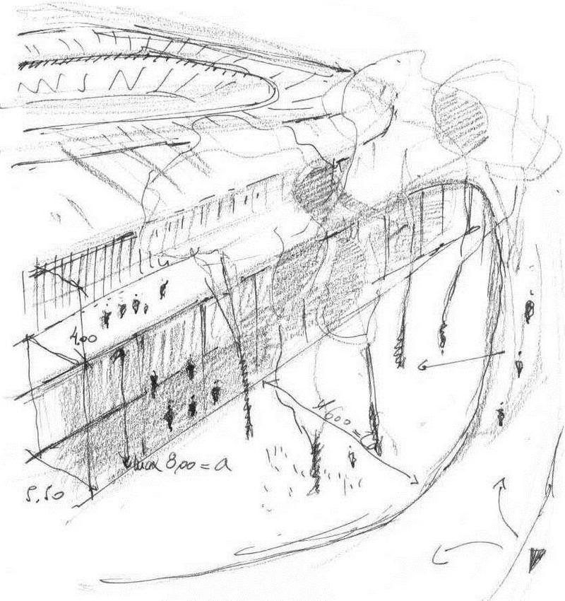 匈牙利建筑师Peter Bordas接受委托设计了这座容纳20,020个席位、满足现代生活需求的新场馆。Peter Bordas的首要关注点是:如何安全地将观众领入森林;如何将工业时代的建筑群和谐地融入天然树丛。基于这两个问题,这位建筑师的设计理念不仅关注到建筑本身,还关注到更广阔的自然环境。