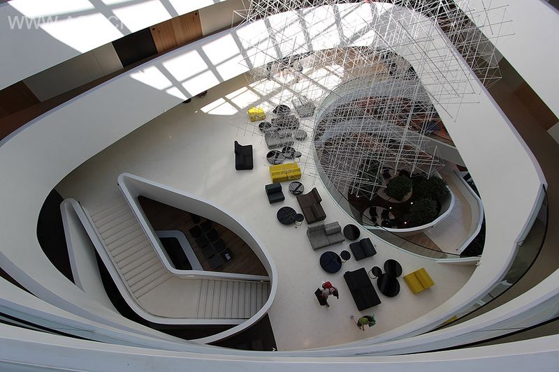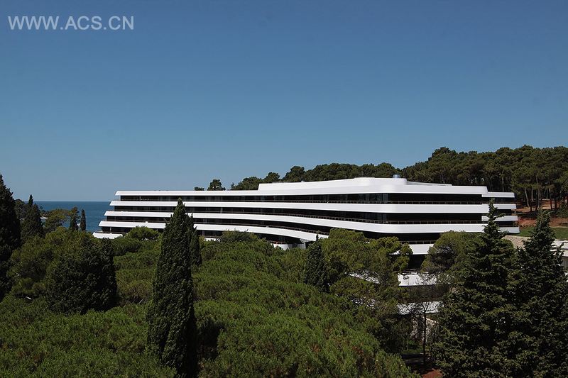 外观设计展现了酒店的形象。该酒店外观主要由水平线条构成,设计的露台让人联想到倾斜的船甲板。建筑的每一层呈渐缩式上升,从各个角度都能看到一个锥形化的立面。高度呈现动态变化的复杂露台使得所有楼层的公共区域和客房动态交织分布,由此形成了整个内部布局。特殊的“Y”形平面带来了十分合理和颇具功能性的组织结构—为所有房间提供绝佳的视野;公共设施围绕中心垂直大厅布局。主厅连接所有楼层的公共空间,形成了具有令人瞩目的高度和规模的中空体量,在这里可以看到酒店内外的有趣景象。
