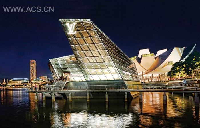 这座水晶阁是LV在新加坡金沙湾的东南亚旗舰店。临着海的建筑延续了LV的时尚与优雅感。建筑的首要挑战就是控制丰富的热带阳光,建筑有着不规则的非对称形体,全玻璃幕墙接收者来自赤道的无处不入的阳光炙烤。建筑师为建筑提供了一个防紫外线的白色线性这样系统,其范围涵盖了所有的内墙和天花板,让人想起帆船的船帆。虽然建筑并没有真正在大海航行,却把这种氛围和LV的气质淋漓尽致的体现。