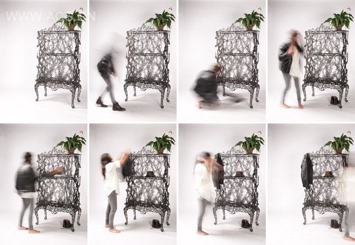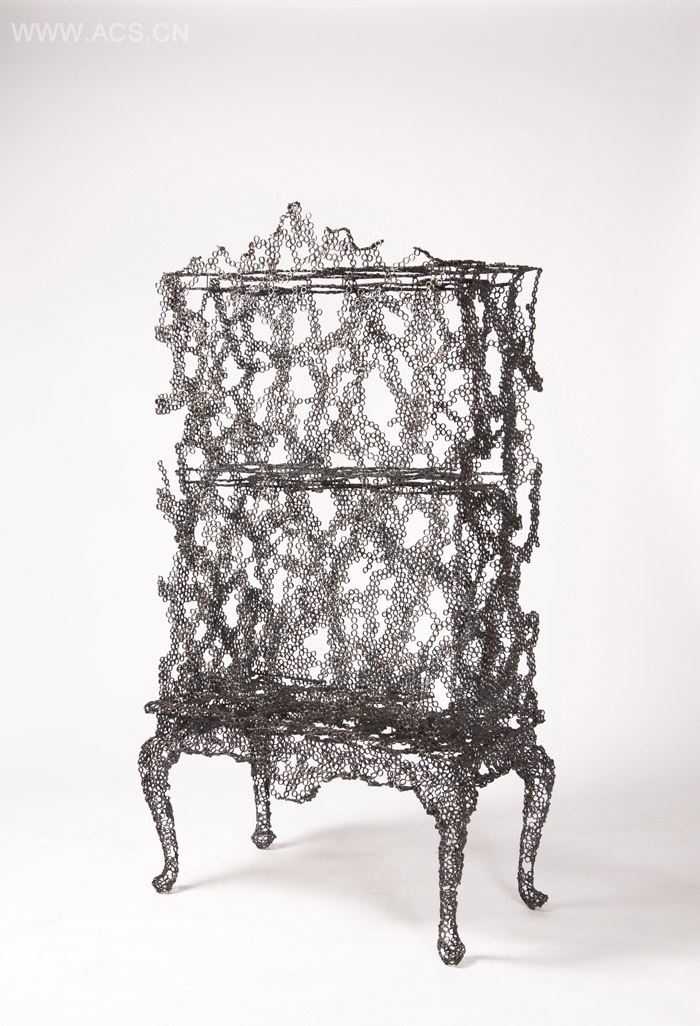 设计师将管状钢片焊接覆盖在木质家具的表面,然后一把大火烧掉里面的木制家具,留下附在表面的焊接钢片。