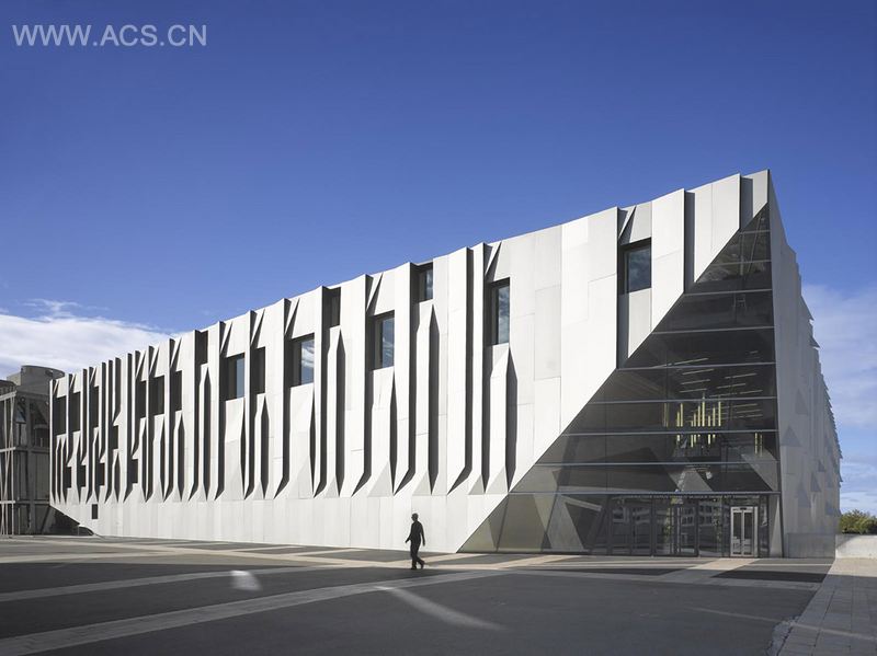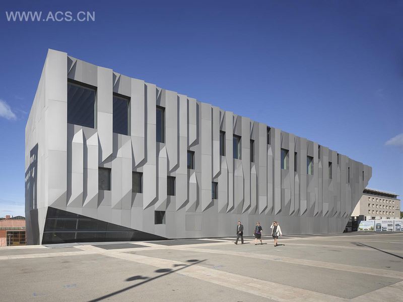 本区域内的地势存在很大差异,其相邻地区的地势也颇不平坦。为了解决这个问题,我们选择铝材作为构成立面的单一材料,并对其进行了局部折叠。