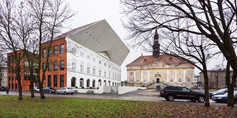 大学建筑体其他三面采用朴素的外观,这是为了模仿Narva旧建筑的特色风格—仅有门窗框架的普通石墙结构。新建筑涂有灰泥的砖墙上规则地分布着一排排窗户,窗子的不同尺寸为严格的布局带来了一丝细微的变化。面向庭院的玻璃墙为安静的小建筑体量赋予了光亮和空间感。