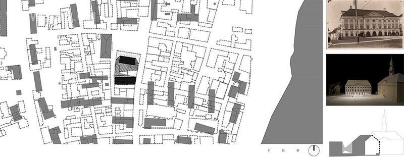 主要的设计理念是清晰地留出原证劵大楼体量的位置。新建筑包括两个概念部分—一是“重建”的虚拟证劵大楼,另一个则是实体的大学建筑。旧证劵大楼笔直地耸立在城市中央,有一部分甚至掩盖了市政厅的主立面。新的设计方案精确地保留了证劵大楼的位置,但用概念性的空间取代了前实体建筑,让市政厅在广场上独领风骚。