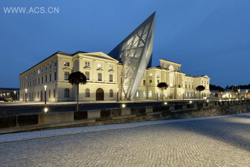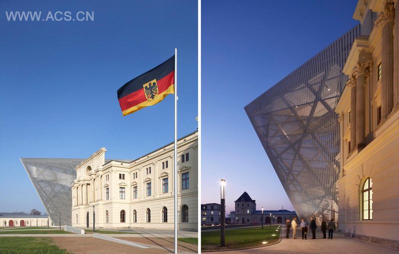 丹尼尔•里伯斯金的获奖项目大胆打破了原始建筑的对称性设计。扩建部分是一个厚重的5层楼高的体量。由14500吨混凝土和钢材料制作而成的楔形结构穿过有135年历史之久的军械库的原有结构。82英尺高的观景平台(楔形结构的最高点为98英尺,29.87m)指向德累斯顿大轰炸开始的地方,同时可以欣赏现代德累斯顿摄人心魄的景观,营造出充满冲突的戏剧化空间。