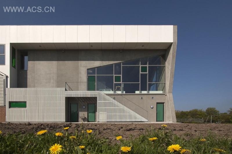 从外面看,这个场馆拥有粗糙的混凝土表皮,大型倾斜式窗户和楼梯让建筑立面显得通透、灵动。