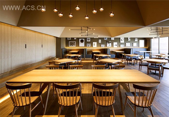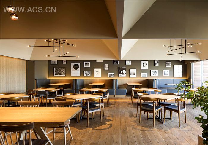 天花板的布置和照明系统的设置,也根据空间需求的不同而特意做出不同的艺术造型。各种不同种类的动态照明,以及特制的配光方案和形状好玩的天花板,在整个餐厅创建出八个独特的就餐区域。这是一个优雅的空间,大量使用的自然装修材料以及绿意盎然的各种植物,让这里显得格外现代格外舒适,这样的餐厅一定会给人们带来难忘的就餐体验。