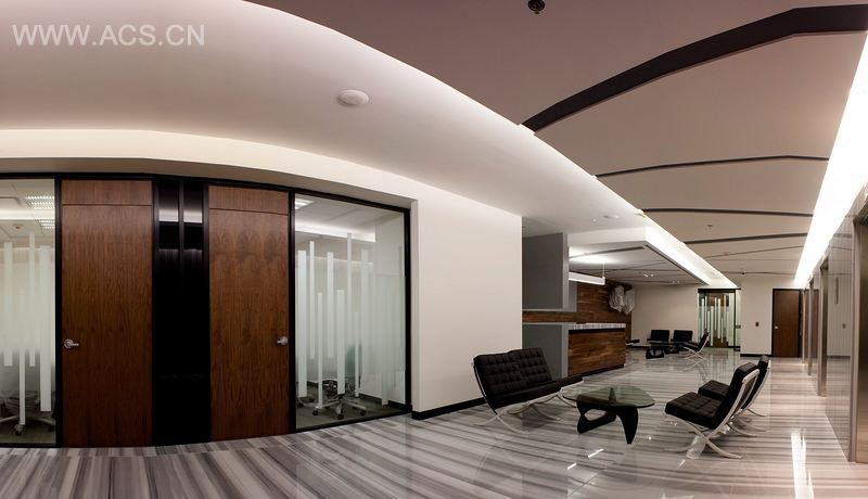 公共楼层是项目最重要的元素,它有宽敞的接待区,还有分别面向客户和供应商的会客室、阶梯礼堂、培训区以及一个专供气流管式输送系统交易的付款台。值得注意的是,所有房间都有自动化投影系统提供舒适良好的服务。装饰物中设计奇异的大理石制品赋予地板华丽感,同样还有天花板的线型图案、直接和间接的灯光组合都提升了空间的细腻感,石墙装饰还赋予了办公室自然感。