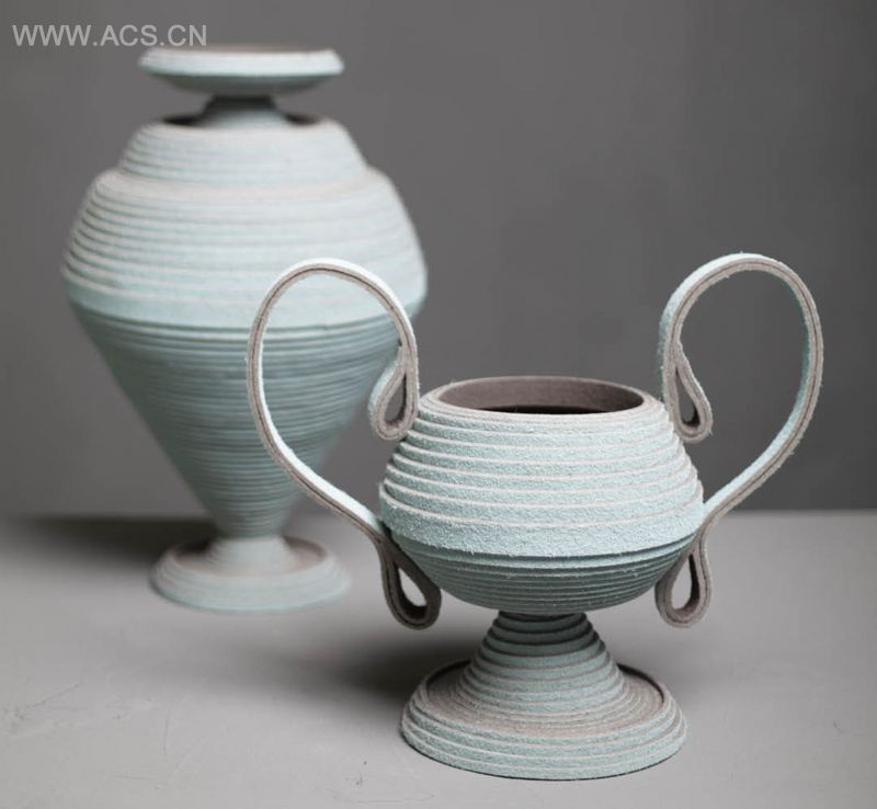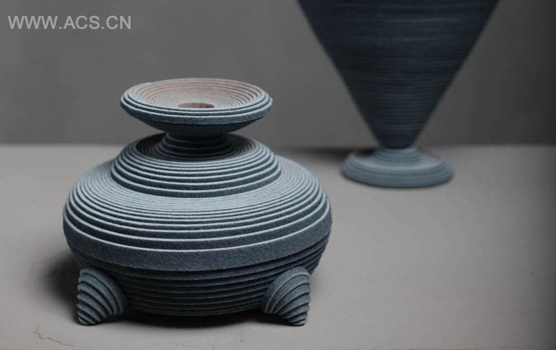 美丽的毛毡器皿。设计师Siba Sahabi新系列Between Two Rivers灵感源于西方文明发源地古希腊美索不达米亚。在工业化瓷器产品泛滥无灵魂的今天,用新方法重生古希腊古器皿神韵。制作的依托依然是古老的陶瓷转盘。精心打造的细腻毛毡一圈一圈转拼交合,形成水瓶和杯子的造型,有的甚至高达50厘米。3mm厚的毛毡两侧喷有涂料,因此最后呈现出三种色彩:外侧色彩,内侧色彩,还有其本来的色彩。