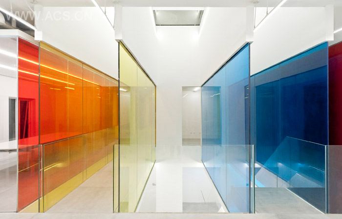 我们利用红、黄、蓝三色的叠加与渗透,在空间内部填满各式各样的色彩效果。方法是将行走路径面对或侧旁的墙面设计为不同的彩色玻璃,通过人在空间中的移动,观看玻璃的角度与层数的变化,颜色的叠加及光线的各种反射,构建出一个无比虚幻的色彩世界。而二层通高的中庭是这个世界的中心,因为有直射的阳光和更多层的彩色玻璃,能够形成最为绚丽、玄妙的色彩效果。