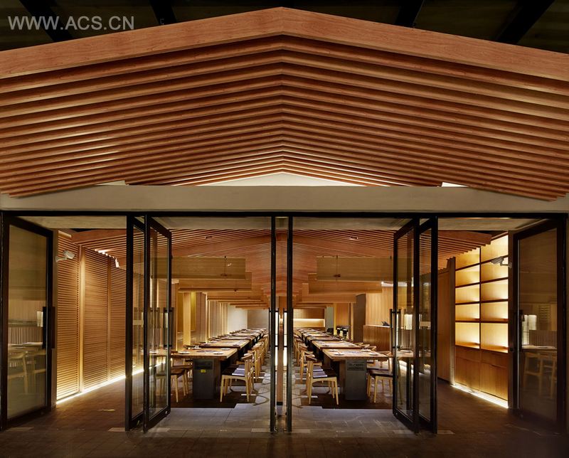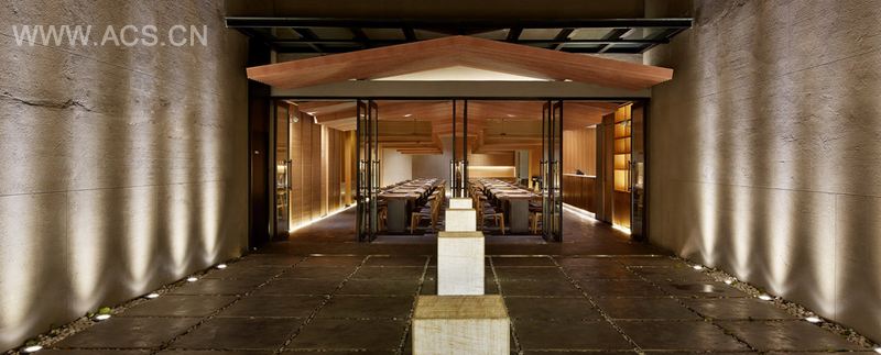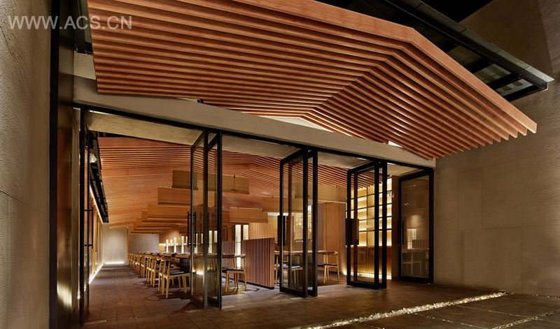 设计理念抽象的还原了日本大阪鹤桥地区的拥挤的街道建筑形象, 餐厅的两个入口安排在”山墙” (中国建筑语汇)上, 进入餐厅三角型的坡顶映入眼帘, 我们刻意压低房檐, 意图用强烈的三角形房顶来表达日式建筑与山林的关系。 在日本建筑中, 如果入口开山墙上, 就叫做”妻入式”; 相反的, 如果是从平顺的房檐下进入室内, 这种方式就叫”平入式”。 房檐的高度是2.1米, 即使作为住宅, 这个高度也很低。作为餐饮公共空间, 让客人穿过这么低矮的房檐进出包房, 设计这个高度被甲方投诉我们毫无常识可言, 这个高度伸手都能触到房顶了。 房檐设计这么矮, 意在弱化墙面, 强调错落的三角形房顶, 墙壁消失于房檐的阴影下, 凸显了在都市建筑丛林中的小小山林。