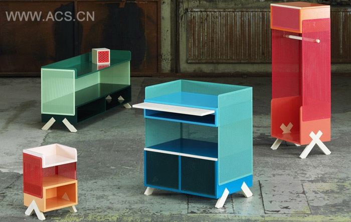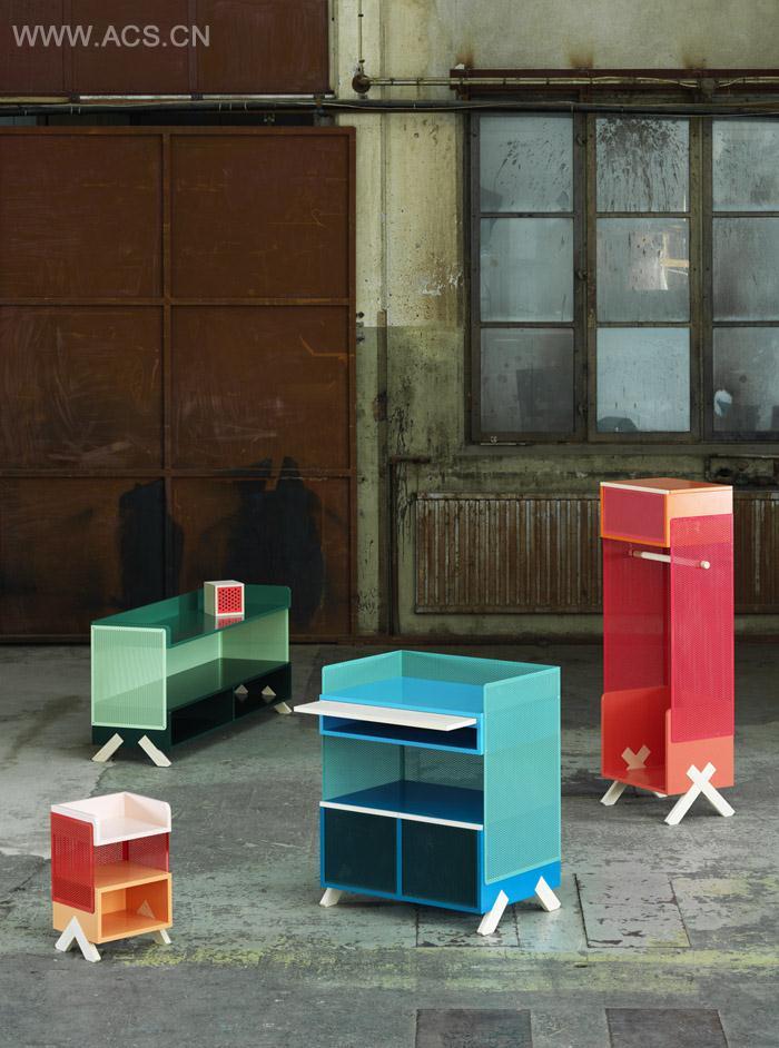 这是Note Design Studio新推出的存储单元系列Peep.一个轻盈,可以允许光线和声音穿透的穿透金属网格透明型家具系列。适用于办公环境。设计师试验了许多不同材料,样式,开孔密度的穿孔金属板。选择的铝板非常轻,会颤动,但是组装后又出人意料的牢固。腿部支撑的设计俏皮活泼。这系列储存单元可以方便的移动。背面的板子可以移动,方便使用电源线和手机充电器。