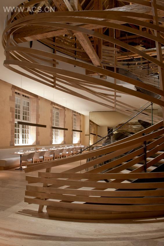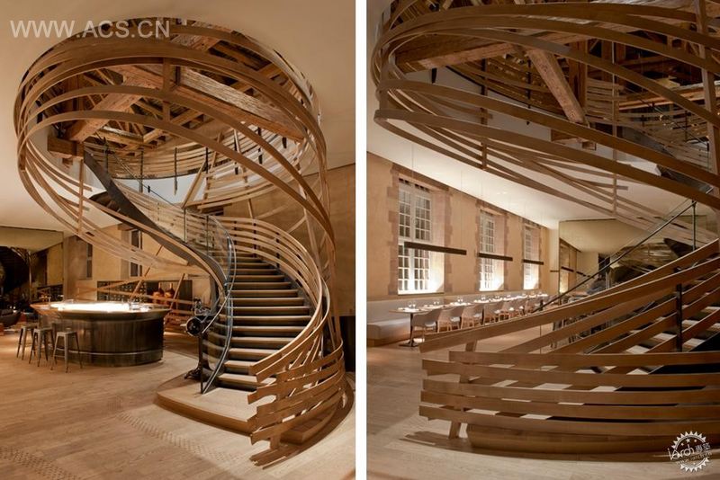 走进斯特拉斯堡酒店餐厅,你会发现这里的楼梯被纠结的木条盘绕着。这是法国工作室Jouin Manku对这个曾经的马术学院进行翻修后,对内部空间进行了重新设计后。