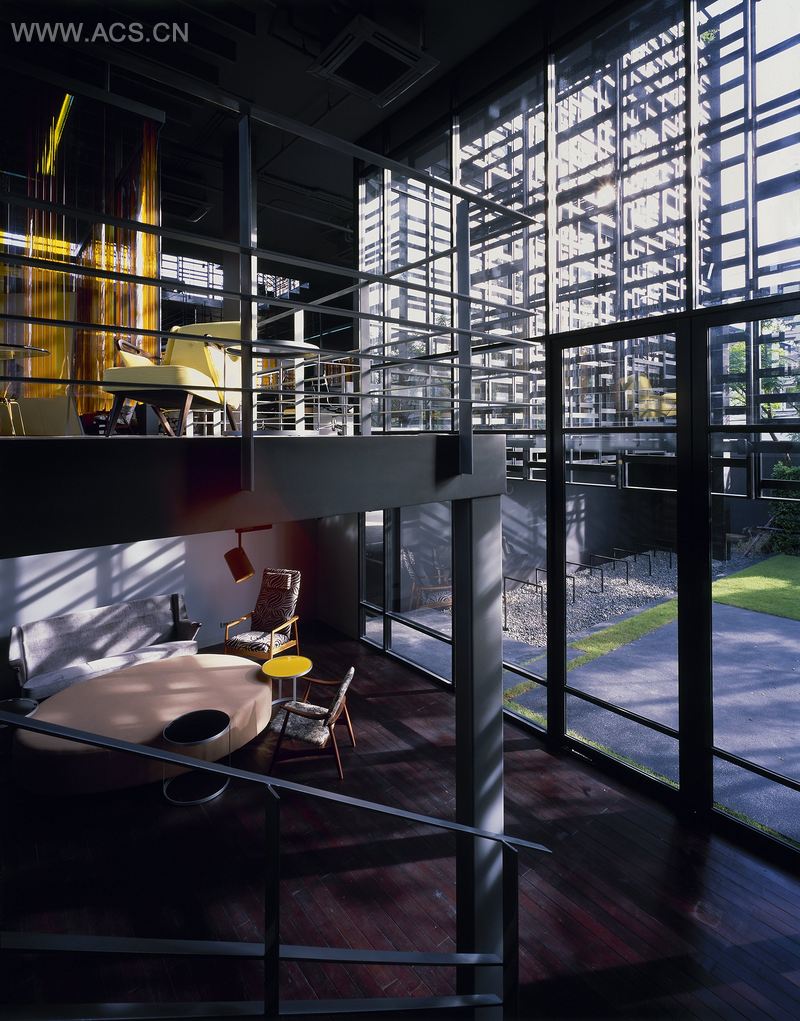真正来说,室内空间最怡人的特点是散布在整个空间的内部屏幕。外部屏幕展现了公司商业领域的技术品质,内部屏幕则直接展现业主和员工的冒险精神。工业材料如彩色聚氯乙烯幕帘被巧妙地融合到建筑中来体现这些极限运动爱好者的能量和活力。透明的屏幕除了分隔和包围空间外,还充当区域隐私级别的指示标。通过使用聚氯乙烯幕帘,办公空间保持了开阔性和透明度。