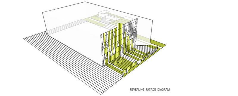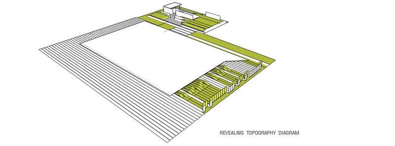 景观旨在打造人与自然和谐相处的庇护所。为此设计中运用了茂密原生植被营造出野趣,与城市相抗衡。建筑立面上的反射折面表皮造型与地形相协调,同时又反射出周围的绿色,并且蔓延至屋顶花园,关联整个场所。