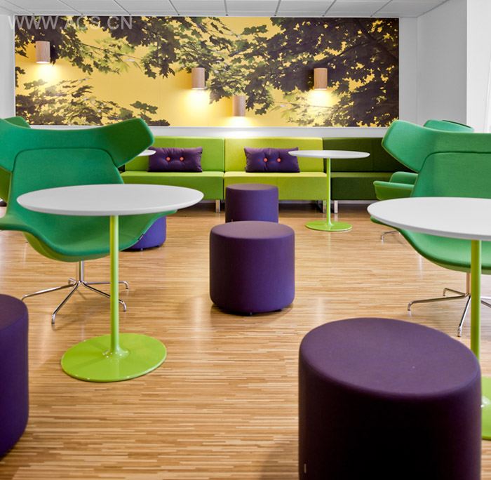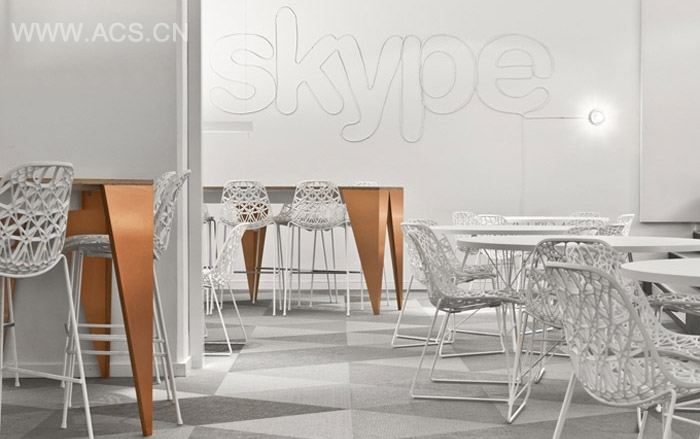 菱形,三角形等相互拼接的图案出现在地板及部分家具的造型中。Skype云形LOGO形象的意向被
