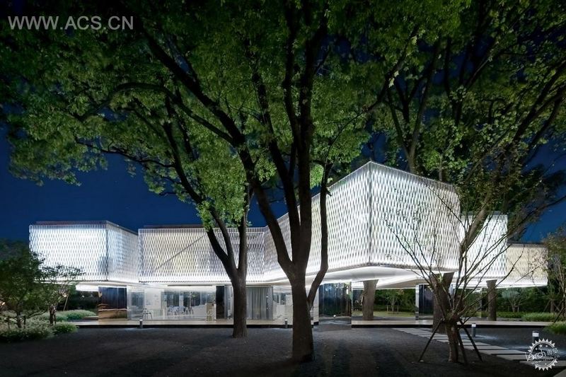 华鑫办公集群位于桂林路西,其入口南侧是一块绿地。这块绿地面向城市干道的开放属性,以及其中的六棵大香樟,成为了设计的出发点,并由此确立了展示中心的两个基本策略:一、建筑主体抬高至二层,最大化开放地面的绿化空间。二、保留六株大树的同时,在建筑与树之间建立亲密的互动关系。