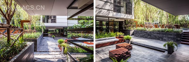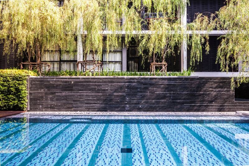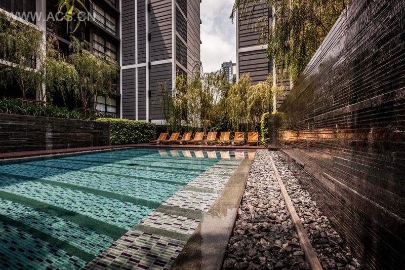 泰国城市中一个安静的公寓公共花园,这个花园只依附一独栋公寓存在,面积有限却层次丰富,空间多重。花园能够支持多种活动且保证彼此不被打扰,同时满足了楼上的用户朝下俯瞰时的美观。不同高度水面与跌水还有那地面和墙面以及屋顶都存在的绿化,这里宛然一个水与绿的三维剧场。轻垂的柳枝成为天然的屏障,保护泳池隐私。天然石材和天然木材是硬质景观的主材,它们被精心运用而具有丰富的细节,为用户提供了一个质朴同时品质的户外空间。