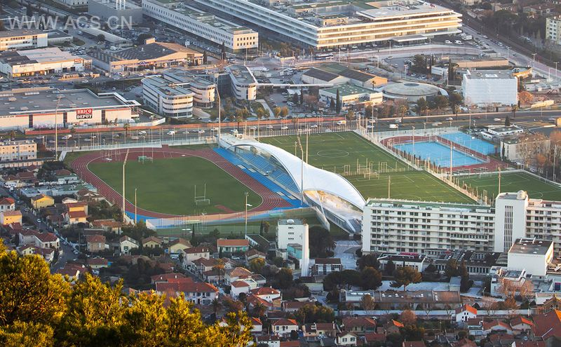 联想起历史上土伦与海洋的关系。两个看台可容纳近3500观众,其沿着200米直线排布的独特设计,使观众可以选择观看两边任意场地的赛事。
