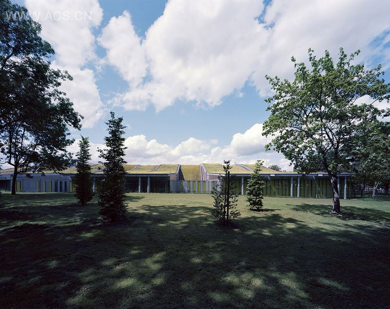 将场地上残余的30年代建筑清除后,建筑师发现场地处于城市--公园之间,因此建筑被设计成一个有着波浪形绿色屋顶的学校,以其柔和的线条和斜坡造型融入到一侧的自然公园中。起伏而彼此错落的屋顶造型避免了直射光,同时又让光线能够深入建筑内部。大跨度的钢结构解放了建筑内部空间。功能布局清晰有条理,大车间靠城市一侧布置,教室与其走向平行,实现理论与手工的交互。