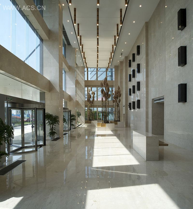 最近,德国Peter Ruge Architekten设计了杭州Hongcheng大厦的大堂室内设计。三层高,面积约为450平方米的大堂拥有中央接待去,等候区,信息区等功能。建筑师将门厅三面外墙打造为全玻璃式幕墙,与外边的自然景色相连。内部的设计灵感也源于自然,采用了一系列有机元素:竹林,天然石块,跌水来定义这系列主题景观。希望这些主题景观元素,形成内外兼的和谐。天花的半透明玻璃和固定在上面的竹竿灯共同作用,根据天气可调节大厅光环境。