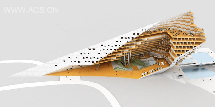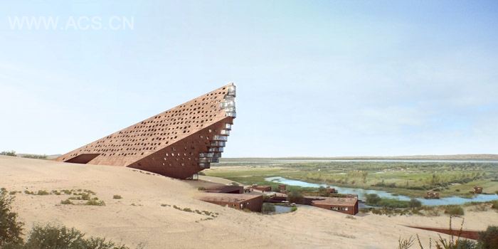 “站在基地上我们看到的是一望无际的沙漠与生机盎然的黄河湿地的强烈对比关系”建筑师于基地调研时感受到位于对比强烈的环境下建筑应与环境交相辉映,互相强化,如同大漠中耸立的金字塔一样,建筑体量应是及其几何化,能够在空旷视野中成为打破地平线而又能与地貌融合为一的形态。建筑概念由此而生——一块砾石从大地中破土而出,经日夜风吹雨打而风化后立于基地之上。由于场地处于沙漠、湿地、黄河三种不同自然景观的交界处,我们在设计时所面临的最大挑战是:如何协调建筑与环境的关系。我们主要从下面几个方面来入手解决这一问题。