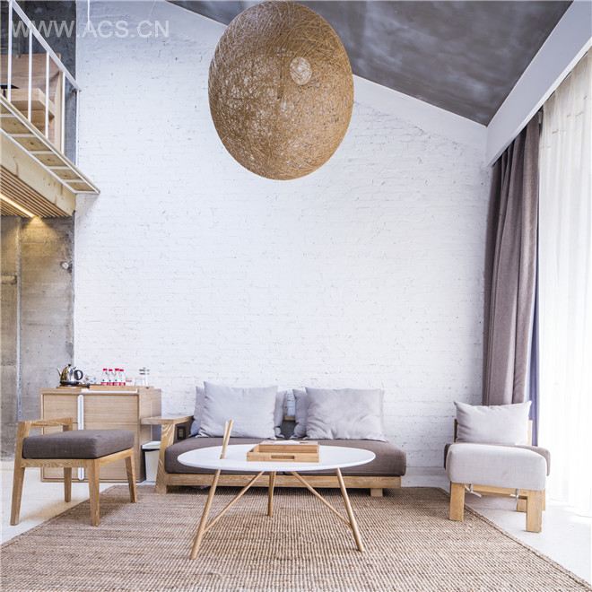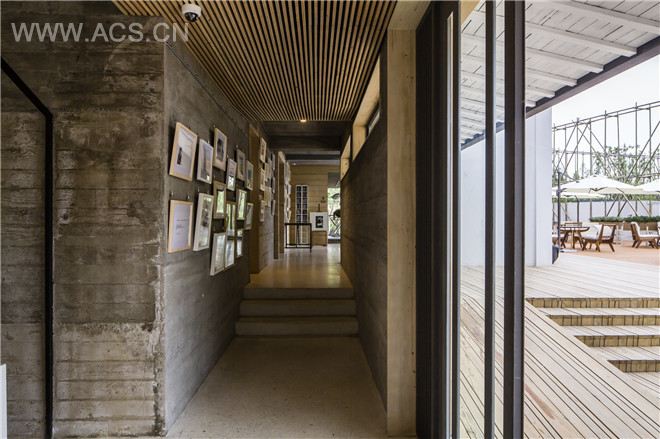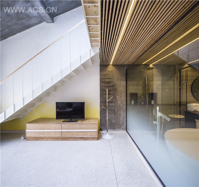 设计师利用建筑的形式及外部庭院空间,设计并发展了景观庭院空间。它是无修饰的、粗旷的、原始的和自然的,同时也是优雅、精致、现代和别致的。原始是通过大量密植与西溪湿地周围相似的植被来体现。而优雅则是来源于建筑材料的选用,如木平台的运用带来一种和谐感并共同组成了外部空间。湿地的原始风格被引入到酒店庭院设计中,将其舒适与愉快的室内风格延伸到景观之中,以一种艺术的形式融合在一起。看似天然无修饰的自然环境与精心设计的房间形成户内户外的反差,简单整体的空间,没有隔墙和固定家具。朴实的房屋里,简洁的大尺度窗户,连接户外,框取景色。精心制作整洁的吊顶和地面与质朴墙面形成对比。室内家具具有明显的中式元素但不失现代,贴心好用。更有隔层的客房,被打造成为有趣的空间,带给客人新鲜的居住体验。