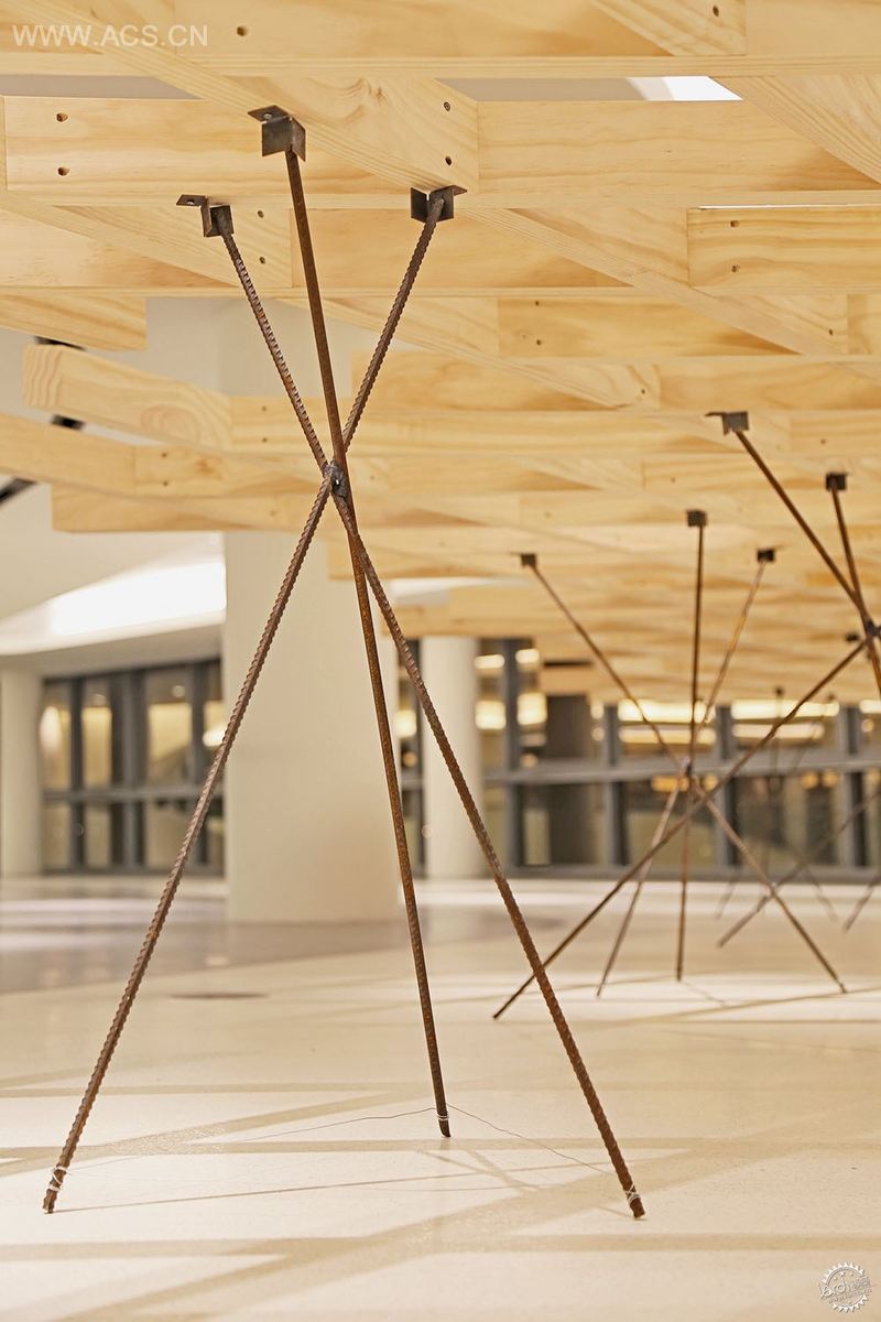 与中立性的白色展示厅相比,Kotnik和Bañón的展示设计用了200根木钉,每根长1米并将其装置成一个模块化的网格系统。这个结构是需要16个氧化钢制脚架来支撑,以达到该平台的稳定性和所需要的视觉密度。Kotnik和Bañón都是新加坡科技设计大学的教职员工,他们对建筑和可持续的设计有着无比的热情。