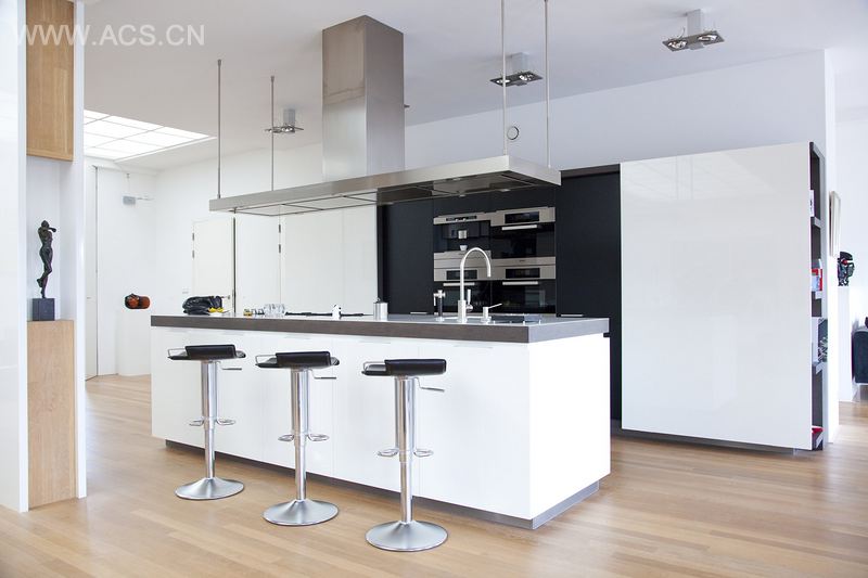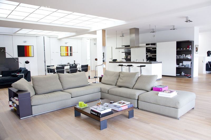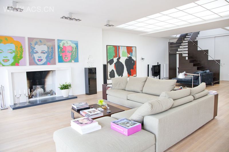 Because the client wanted to hang lots of colorful paintings, the architect chose to keep the materialization minimalist. So oak floors and smooth white stucco creates a balance between all s.