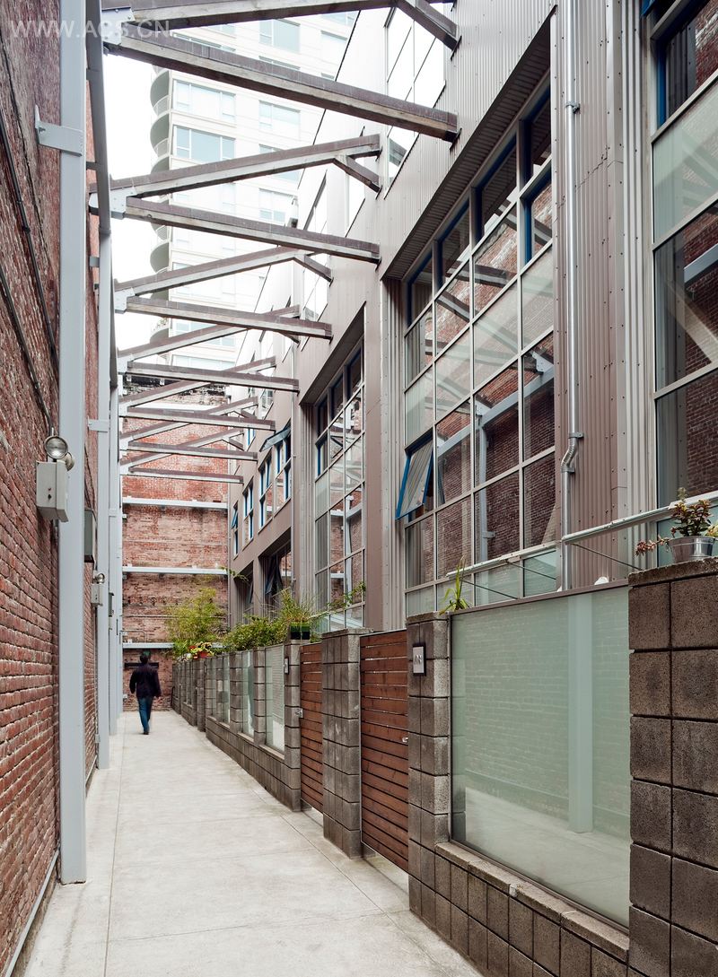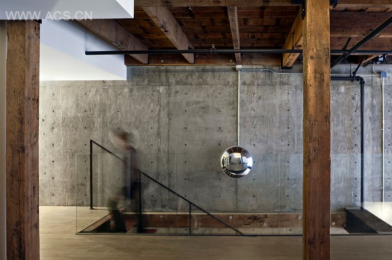 In contrast to the existing heavy-timber and rusticated brick structural shell which are left exposed, sleek new interior finishes were replaced throughout including wall and floor finishes, kitchen and bathroom millwork and a new steel cantilever stair that connects the living areas on the ground floor with the sleeping areas on the mezzanine.