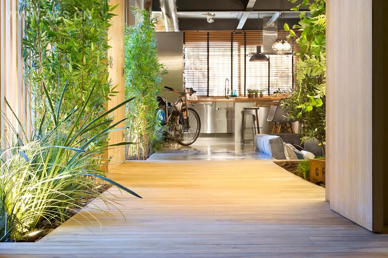 To step in this former commercial space turned into a loft, we need to open a wide and generous solid “Iroco” wood set of double doors with iron fittings custom made at the owner’s iron foundry. And as soon as we set foot over the natural oak parquet, we are welcomed by a huge “fish tank” without fish, were leaves and green blossoms float in amidst almost liquid light. We are not talking about the typical bamboo reeds or about the very solemn Zen like interior garden, but about an arrangement of local trees of varying heights over a bed of pine bark splashed over by a cascade of light beaming from a false skylight.