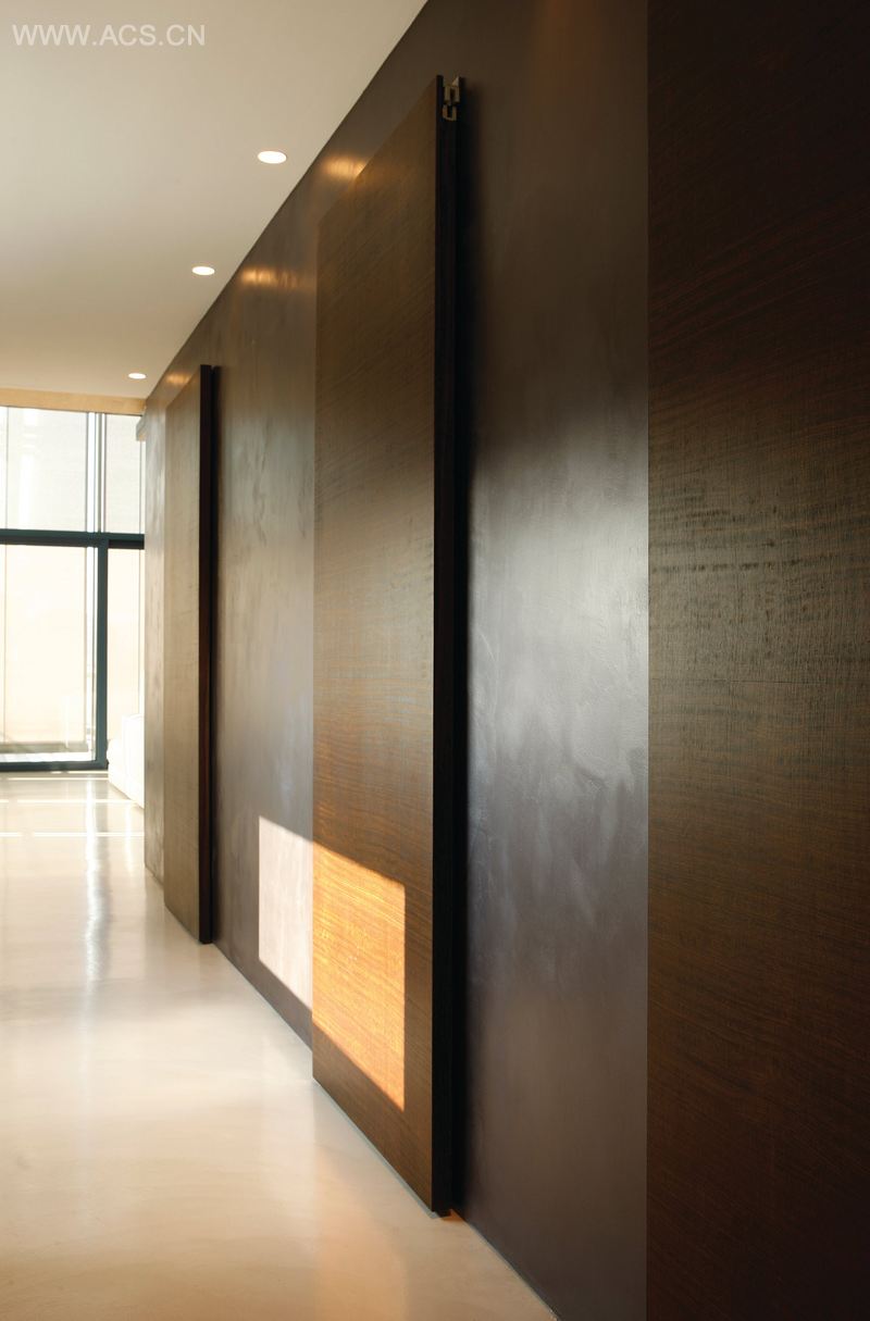 The concept is d on the idea of the open space loft that can be transformed according to the needs, in different rooms like a traditional apartment. This can be possible thanks to wooden panels in Daniela Scared Chestnut that can be opened and disappear into the walls.