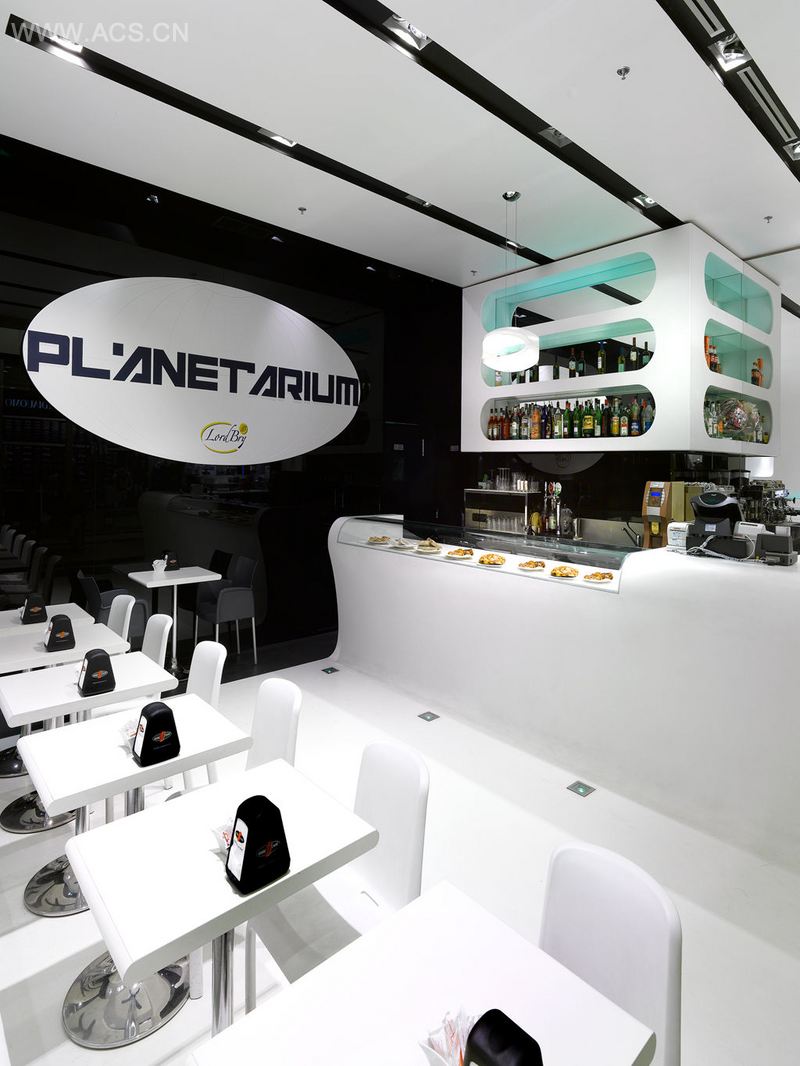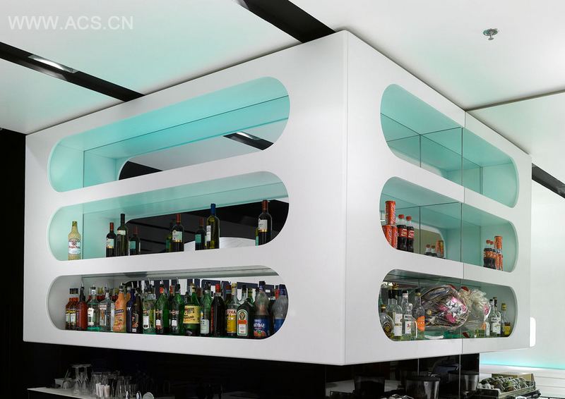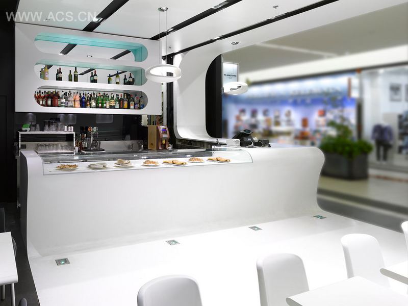 The whole venue is made in corian, a single material that from the floor, goes up on the walls, joins the ceiling and descending it defines the shape of the bar as a single piece.