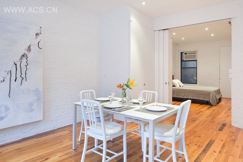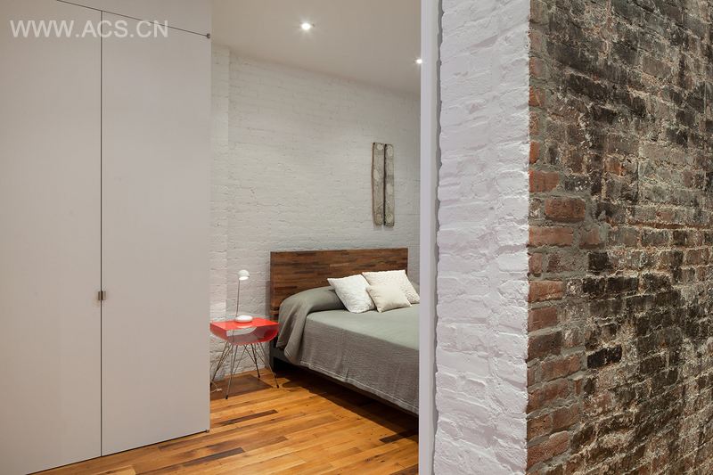 Reclaimed white oak flooring and a recycled wood beam as part of the kitchen counter added another of depth to the existing materials and character of the apartment. A large sliding door separates the living area from the guest bedroom while a set of tri-sliding doors that pocket between closets divide the large bedroom area into two separate rooms as needed.