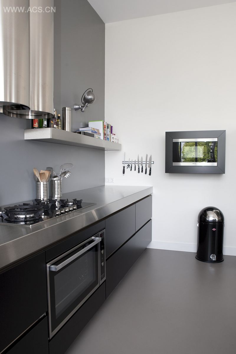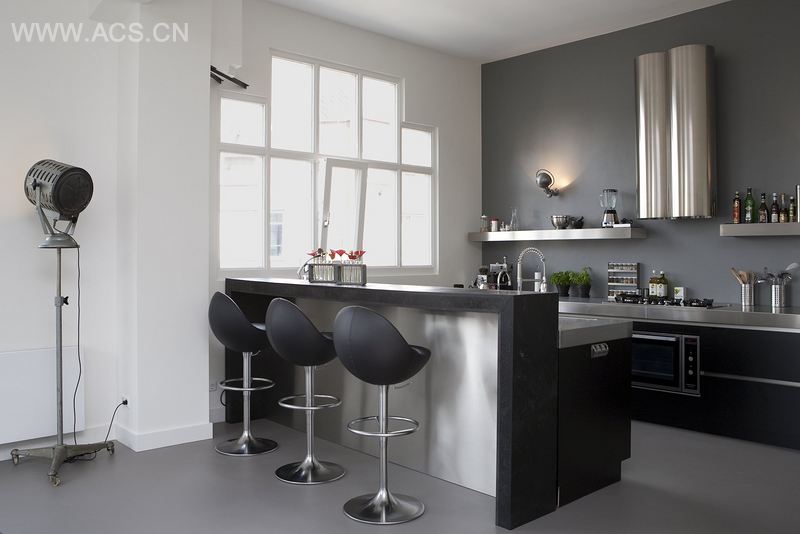 Kimmik created a new open kitchen with stainless steel worktop. They introduced colour changing LED lights, huge iron cabinets, concrete ciré and walls painted in different shades of grey. Together they made nimble decisions to bring a unique feel to this apartment.