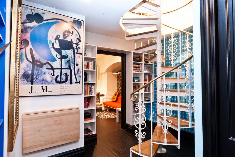 The original winding staircase has an open feel with a simple wrought-iron design in white and hardwood steps. The surrounding walls are covered in artwork and a bold vintage-inspired wallpaper.