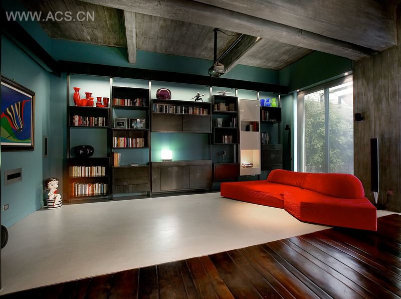 The access to the bedrooms walks through a varnish red paint corridor, characterized by an irregular ceiling shape, well-lighted by recovered industrial neon banner groups.