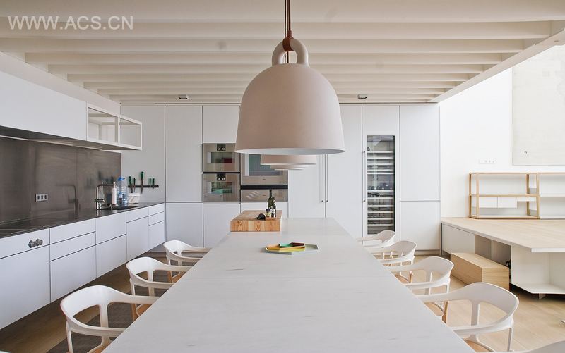 The large loft volume has been preserved to highlight the unique and fluid space while maintaining visual continuity. The space division is accomplished through sliding doors and curtains. White is the predominant color enhancing the natural light from the Mediterranean Sea.