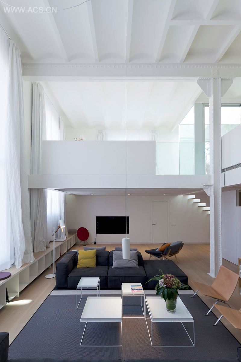 Natural light flows generously inside the loft through large windows. Long curtains with complex textures filter the light adding theatrical value to the space. In order to maximize the amount of light and to open to the Barcelona blue sky, a large skylight .