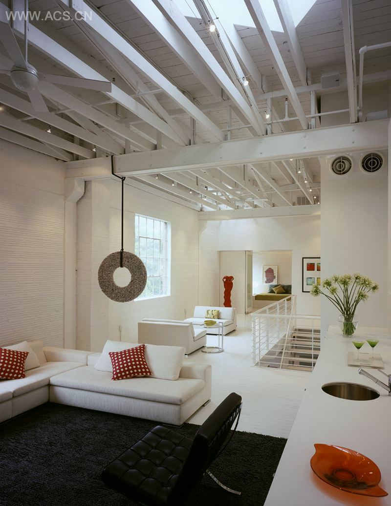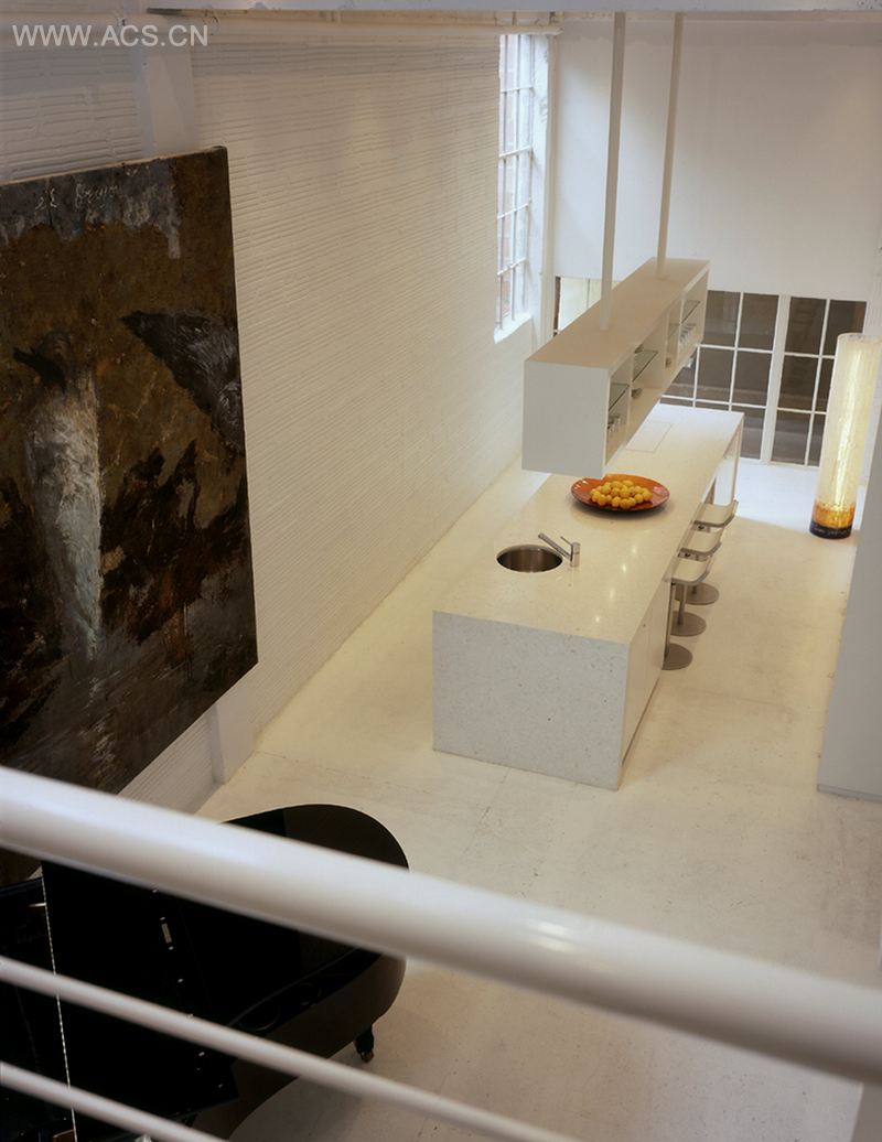 The color scheme for the unit is universally white for the walls, floors and ceilings. The art provides the color accents as do several color “episodes” conceived by the architect—the chartreuse of the spiral stair to the roof deck and of the glass tile in the shower floor and bench, the orange walls of the powder room and the apple green of the daybed in the guest alcove.
