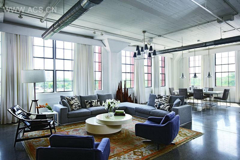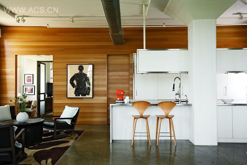 The design groups service areas in the center of the overall plan, leaving the abundant windows –all with city views --for the major living spaces. This central zone is clad in white oak siding which lends natural warmth to the public spaces. The kitchen, recessed into this service zone, is also open to the large living and dining space. A 30’ long island with stainless steel top and sides houses the cooking and washing functions and integrates seating and storage as well.