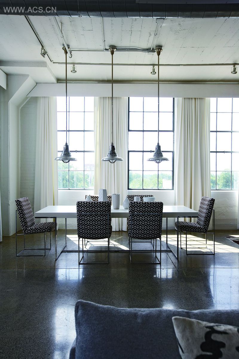 Custom steel interior windows and doors, painted the same gun l as the existing serve as a unifying material throughout, as do the dark concrete floors which have been polished to a reflective finish.
