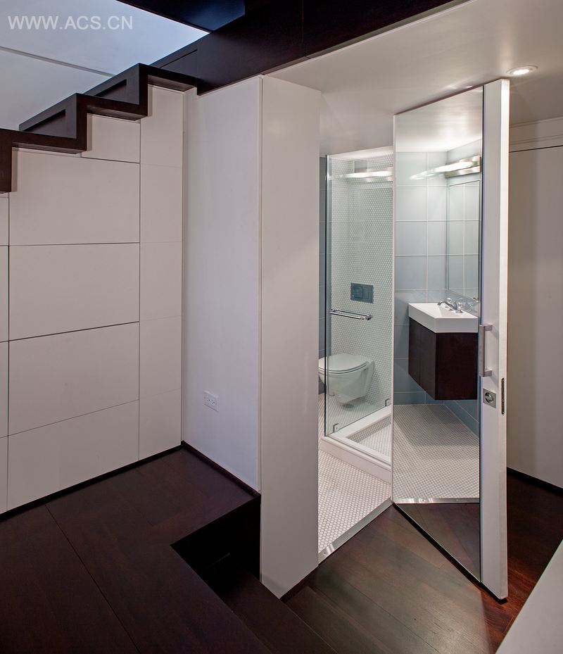 Every inch is put to use, with stairs featuring built-in storage units below, similar to Japanese kaidan dansu. The apartment is crafted like a piece of furniture, with hidden and transforming spaces for things and people.