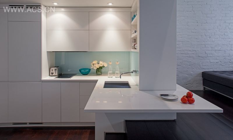 The architectural strategy creates four “living platforms” that accommodate everything necessary, while still allowing the apartment to feel open and bright. The spaces are interleaved, with a cantilevered bed that hovers out over the main living space, an ultra-compact bath tucked beneath the stair, and a roof garden with glazing that allows light to cascade through the space.