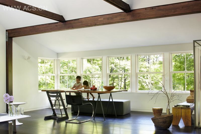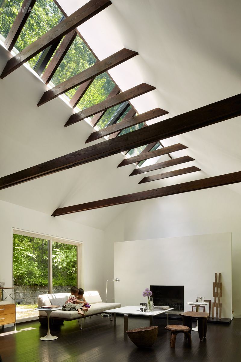 Conceived as an open loft with a play of natural light and located on a two and a half acre hillside surrounded by a pristine national park in the Hudson Valley, this 1960’s log house was completely renovated by TAKATINA.