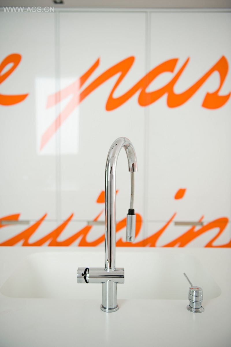 The kitchen is furnished with white modules ofthe Brand Santos and has a Corian countertop with oranges stools from Edi & Paolo Ciani for Calligaris. Its office is decorated with orange chairs, designed by Archirivolto for Calligaris and aglass table.
