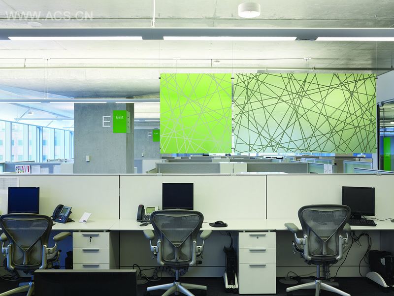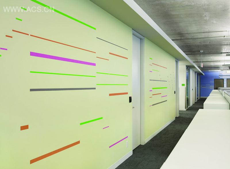 该座7层办公楼的外墙图,房间间隔和电梯大厅的导视标识增加了开放办公室布置的氛围。基于几何形状开发出来的清晰图形图像通过每层楼的外墙和控制板展示出来,缩小了艺术和设计差距。