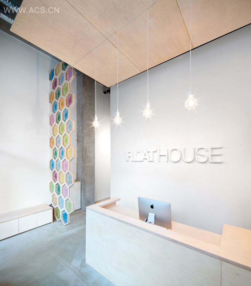 Office of McFarlane Biggar (omb) designed the FloatHouse, a floatation center in Vancouver, Canada, that welcomes you into the space with a 17 foot tall screen made from birchwood hexagons woven with colourful hemp twine.