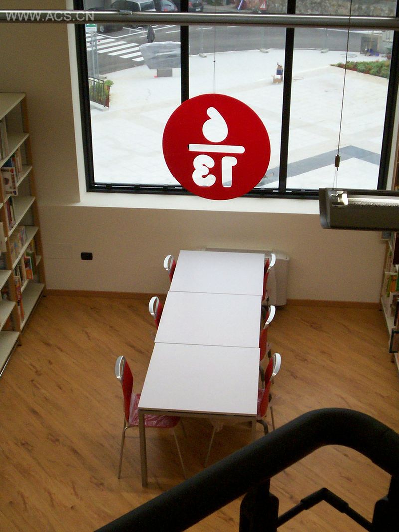 卡萨尔格兰德是意大利北部的一个小镇。城市图书馆,影剧院,艺术画廊和诸多社会福利事业都是当地文化中心的一部分。这里是年轻人最常用的聚会场所之一。因此,他们决定为这些建筑设计标识系统。图书馆是一个开放空间,很高,而且双层。从每个角度你都可以看到整个图书馆。因此,他们决定利用圆形标志挂在天花板上,这样从每个角度都可以看到。这些圆形标志由不同颜色并带有剪裁图标的树脂玻璃做成。单词首字母大写就是图标。比如:A指成人区,M指媒体区。对于儿童区域,他们用数字作为标识。比如0-6指0到6岁的婴儿区,6-13指年幼区。
