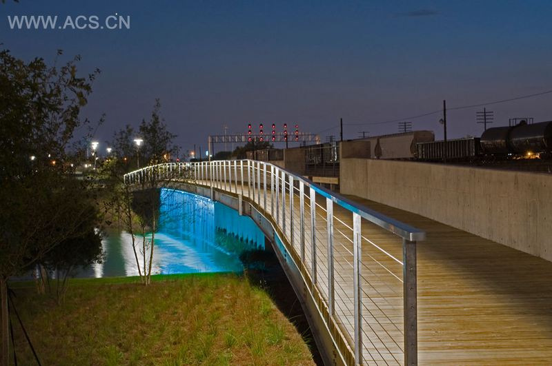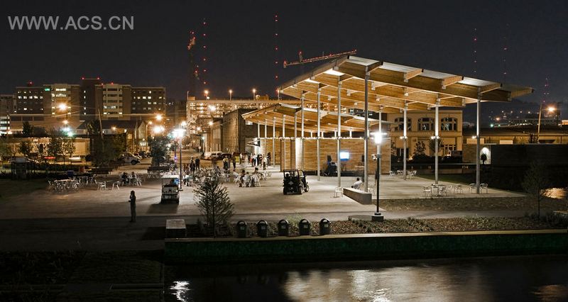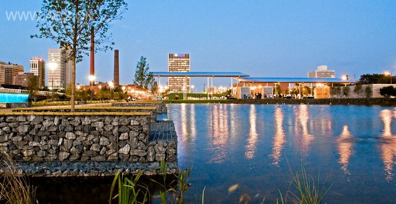 公园曾经是一个仓库和制砖场,它大部分利用之前建筑的回收材料,来创造多功能的广场和道路,为演出、食物运输和休息提供场所。公园有四个街区长,一个街区宽,是历史上地势最低的小镇。这个项目设计在宽阔的水域上,为灌溉提供大型蓄水池。另外,从小溪和一系列的池塘中排放出的水流形成夏天的喷泉。水域系统中开凿了不可或缺的蓄洪池,多余的土料堆积成铁轨高架桥旁的一系列小山。公园包括不同规模的表演场所,超大规模的有年度“Crawfish Boil”区,吸引了三万音乐迷。不论喧闹或宁静,白天或晚上,缓慢行驶在两个方向的货车在公园里川流不息,好似在跳着一曲优雅的芭蕾舞。